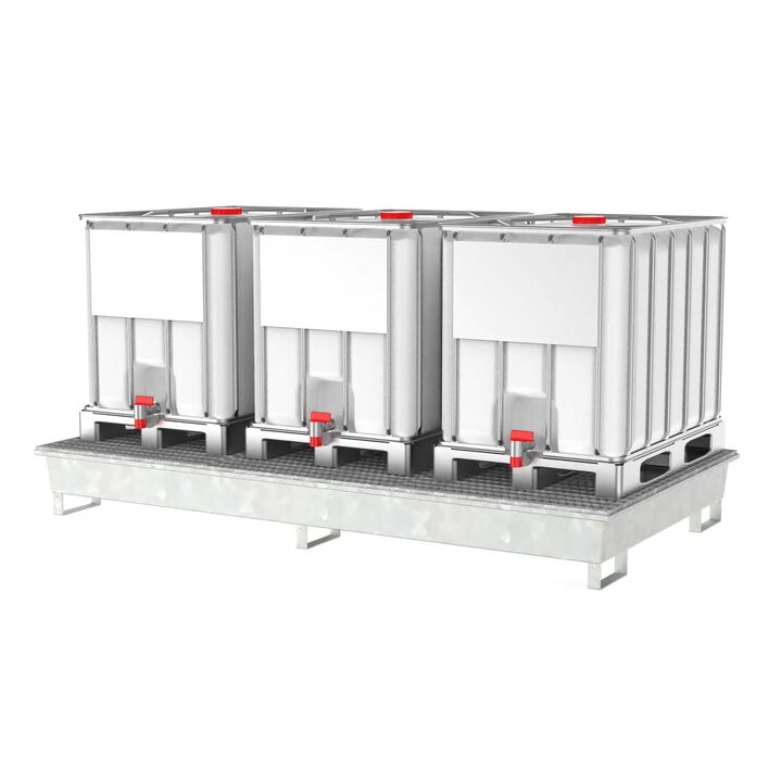 Auffangwanne aus Stahl für 3 x 600 l IBC, verzinkt, mit Gitterrost, 2690x1450x310 mm