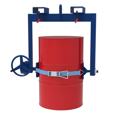 Die Fass-Kipptraverse zur Aufnahme von 200 l Stahlfässern ist die grundlegende Variante unserer Kipptraversen. Diese Fass-Kipptraverse ist mit gummierten Greiferschalen ausgestattet, die den Fassmantel schützen. Das Fass wird in der Fass-Kipptraverse mittels Ratschenschlossgurt fixiert. Das Schneckengetriebe kann wahlweise per Handrad oder Haspelkette bedient werden und steuert den Schwenkprozess bis 360° selbsthemmend.